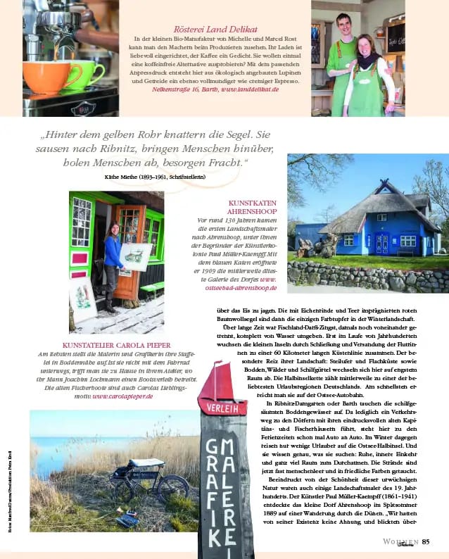 Die entstandenen Reportagen für Wohnenträume zeigen Fischland-Darß als einen Ort, an dem modernes Wohnen, Naturverbundenheit und individueller Stil miteinander verschmelzen. Mein Anspruch war es, nicht nur schöne Motive zu produzieren, sondern visuelle Geschichten zu erzählen. Jedes Bild sollte neugierig machen und Lust darauf wecken, sich intensiver mit dem Ort und den Menschen dahinter zu beschäftigen. Genau hier liegt die Stärke von Lifestyle Fotos in Magazinen: Sie inspirieren, ohne aufdringlich zu sein, und schaffen Identifikation. Die Zusammenarbeit mit der Redaktion war dabei sehr vertrauensvoll und kreativ. Gemeinsam wurden Bildideen entwickelt und vor Ort spontan weitergedacht. Fischland-Darß lebt von Momenten, die man nicht planen kann, und genau dann entstehen Lifestyle Fotos, die ehrlich wirken und eine besondere Tiefe besitzen. Am Ende steht eine Serie, die den ruhigen, hochwertigen Stil von Wohnenträume widerspiegelt und gleichzeitig den einzigartigen Charakter dieser Region sichtbar macht. Insgesamt sind Lifestyle Fotos entstanden, die zeitlos sind, Geschichten erzählen und das besondere Lebensgefühl zwischen Meer und Bodden nachhaltig vermitteln.